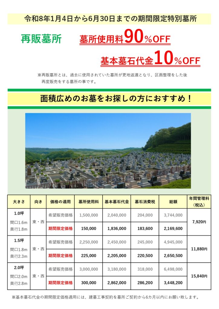 トップ >お知らせ >再販墓所期間・地区・基数限定販売のお知らせ
