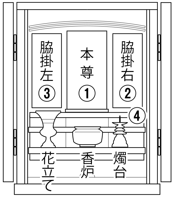 - ※1 一般家庭の仏壇では阿弥陀如来ですが、釈迦如来の場合もあります。また阿弥陀如来や釈迦如来が座している場合もあります。詳しくは菩提寺とご相談することをお勧めいたします。