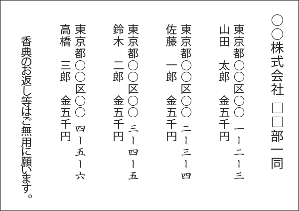 連名は可能ですが多くても3名までにします。4名以上の場合は、表書きに代表者の名前や団体名を書き、別紙に全員の「住所」「氏名」「金額」を記載し同封します。香典のお返しを辞退するときはその旨も記しておきます。