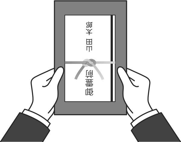 受付で記帳を済ませてから袱紗から取り出し、相手方から読めるよう向きを変えて、袱紗を台にして両手で差し出します。お渡しするときにはお悔やみの言葉を添えましょう。