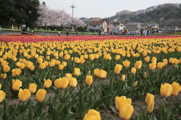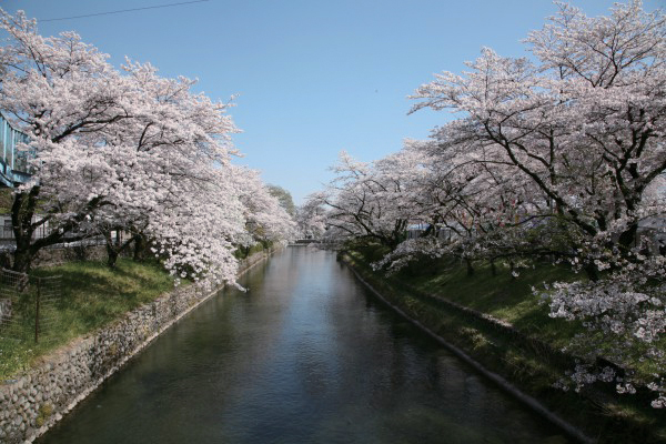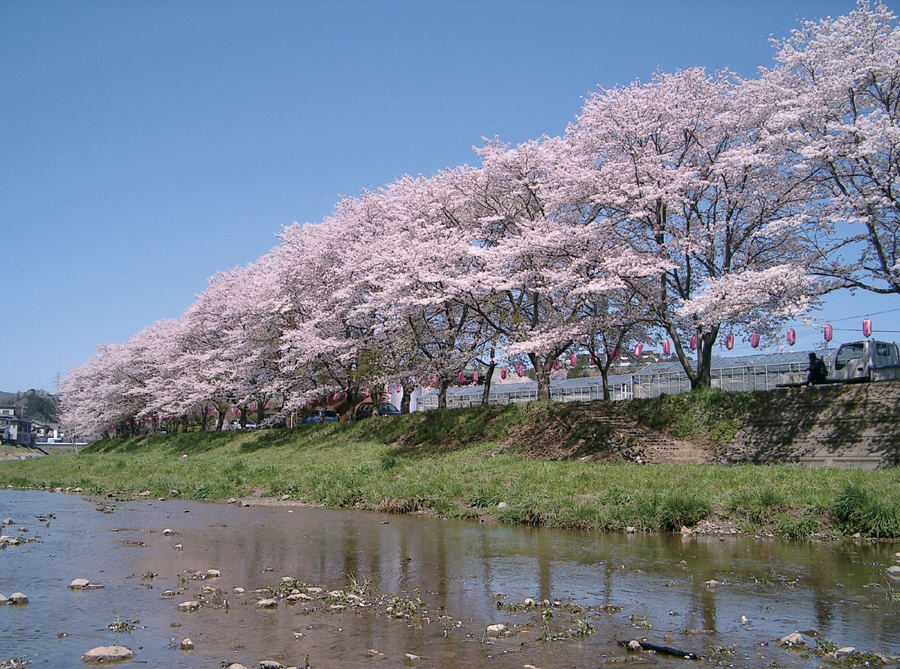 塩田堤には108本のサクラの樹が植えられていて、3月下旬から4月上旬までの間は、観光協会による提灯の飾り付けが行われます。平井川の川面と堤に咲く満開のサクラのコントラストはとても美しく、週末にはたくさんの人がお花見に訪れます。